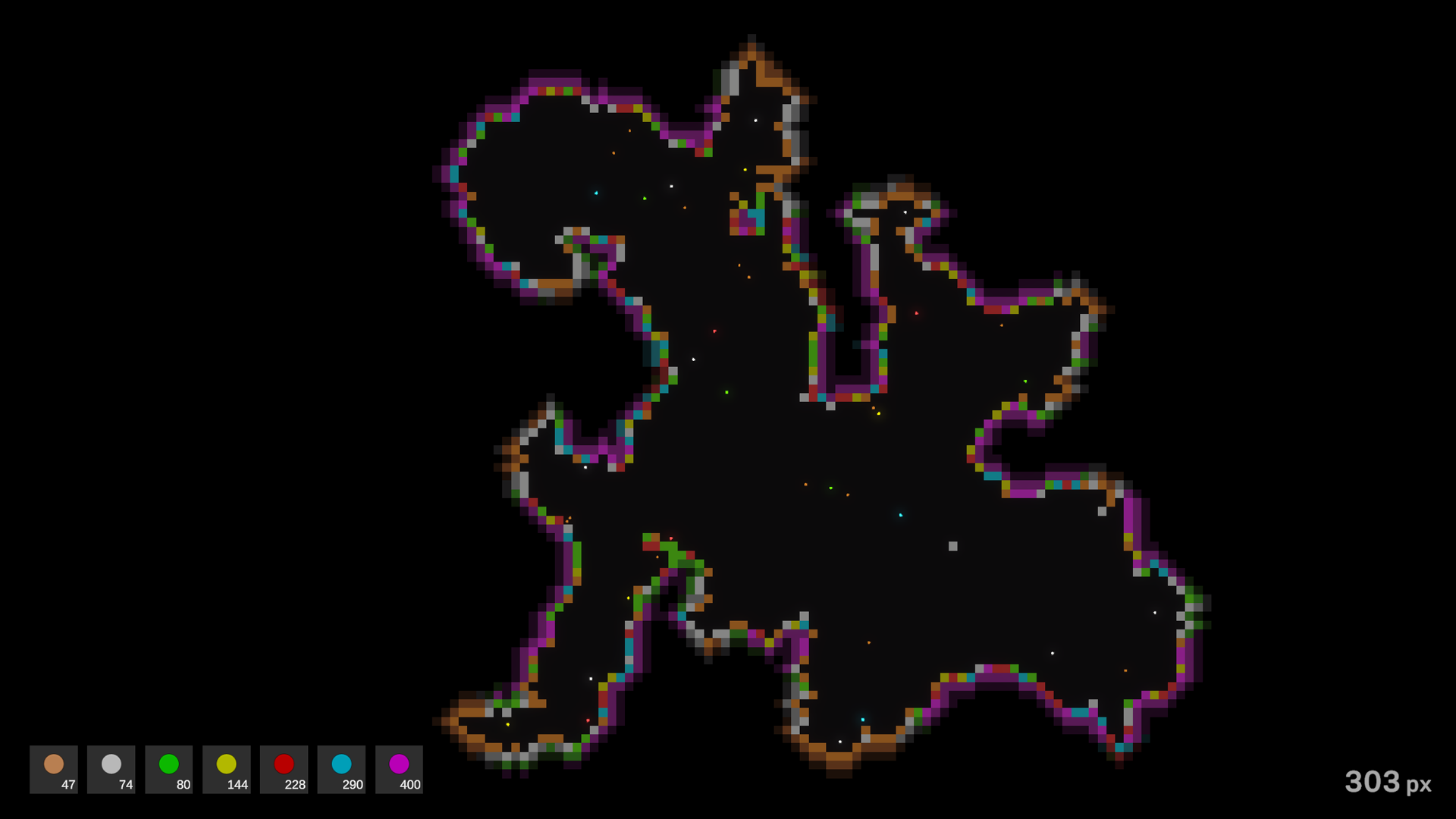 fyi, you need a bounds check on ball location each iteration.. just got a memory access error when a fast ball i spawned snuck out of a corner (my "hole" was only about 30 wide by .. maybe 40 tall (oddly shaped of course), but a freshly spawned fastest-ball just snuck out, and effectively when it hit the went out of the grid, the browser threw an error.
